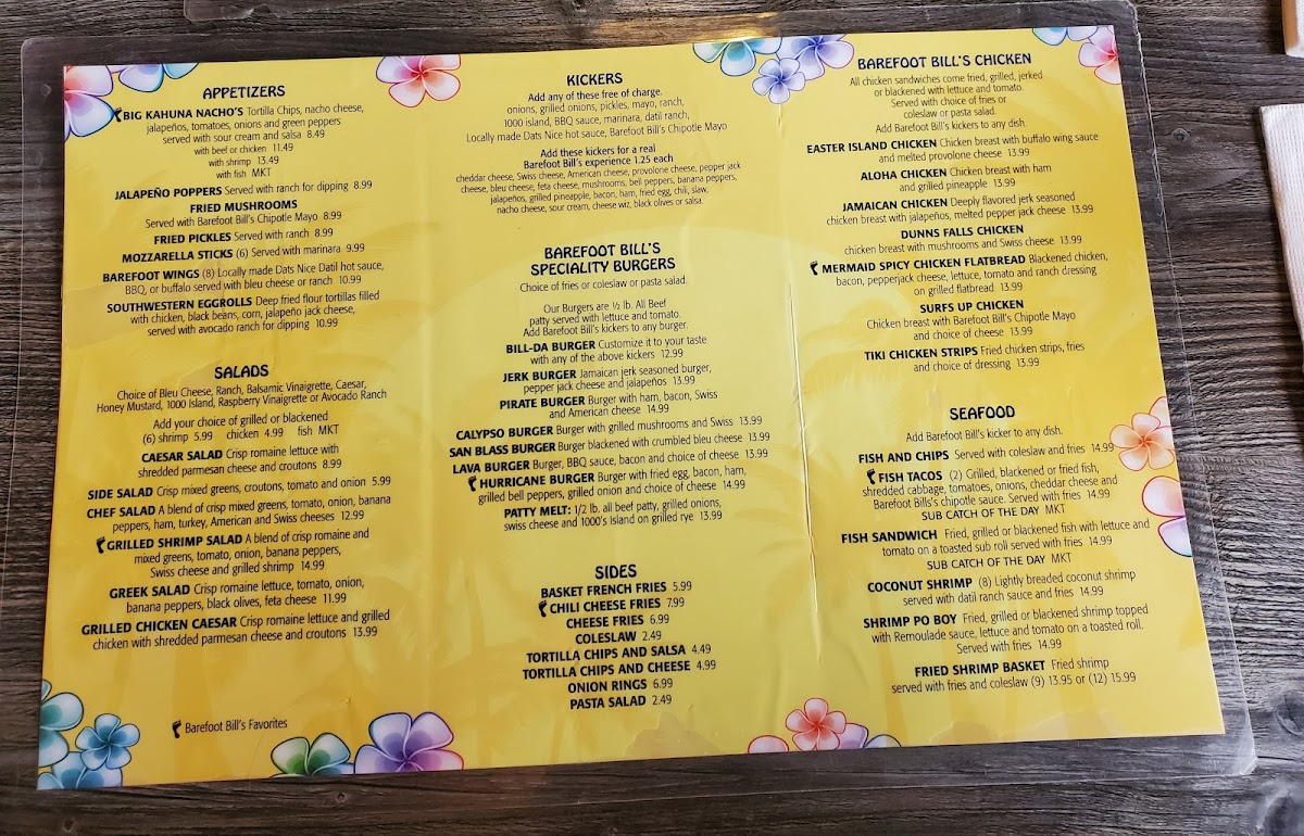 Start your meal with crave-worthy sides like Chili Cheese Fries and Onion Rings. The Barefoot Bill's Chicken selection features mouthwatering choices such as Easter Island Chicken and Jamaican Chicken, showcasing unique flavor profiles. Seafood lovers can indulge in Fried Shrimp Baskets or tantalizing Fish Tacos, customizable with grilled, blackened, or fried fish.